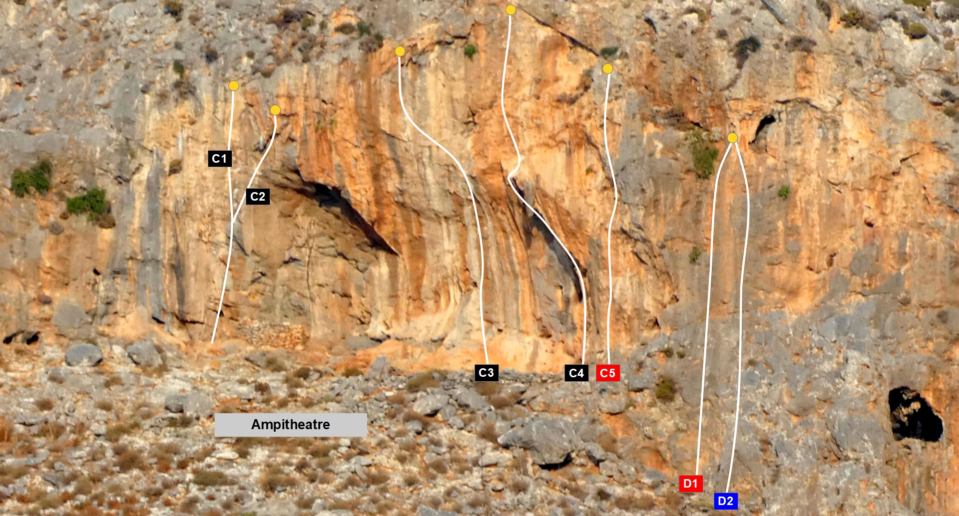 | C04 | Lysistrati | 7a+ | 30m | Steep tufas to an interesting pull over the bulge, and then the wall keeps you thinking. Excellent |
