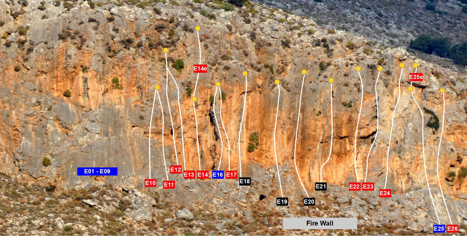 | E21 | Fire Wall | 7b | 25m | ** | Two hard crux moves. Long reaches and getting very polished |
