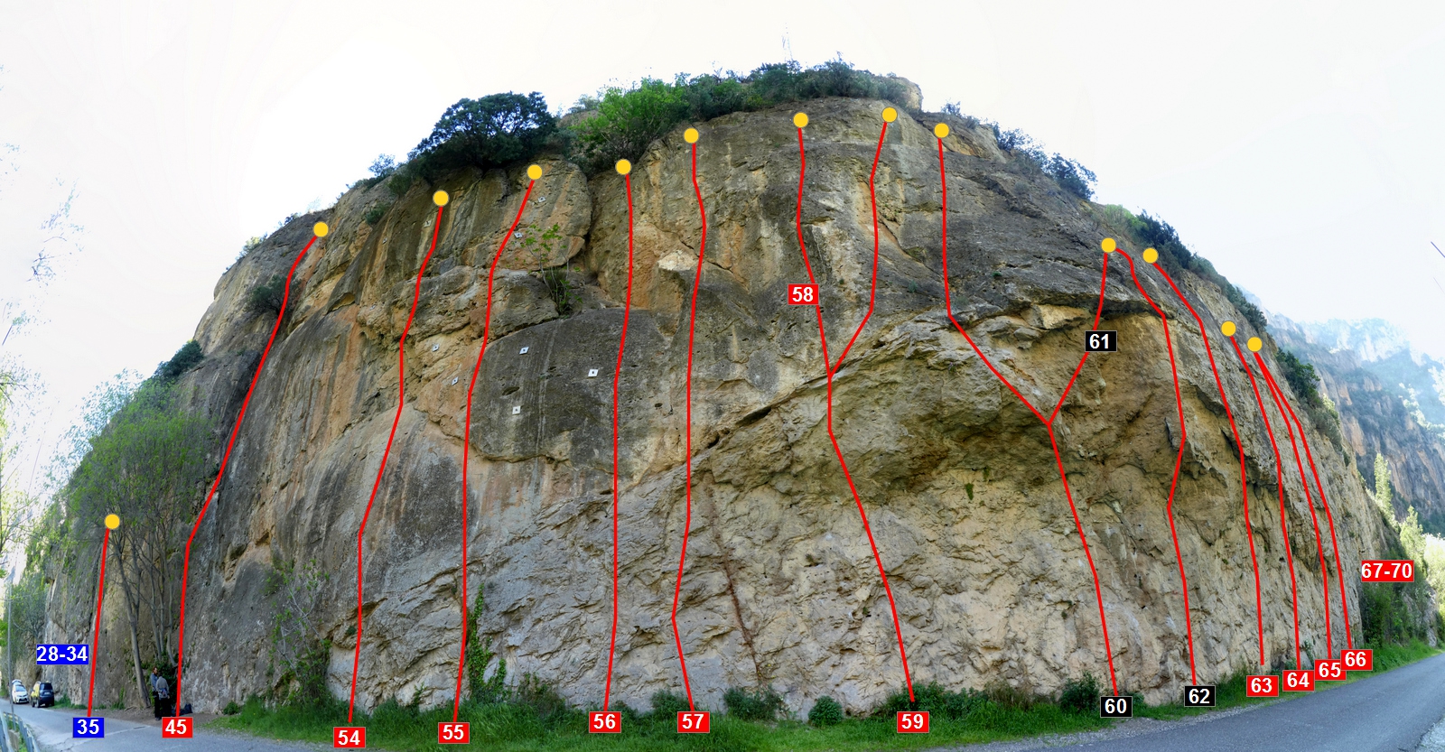 | 70 | la Perica | 5c | 15m | The last route on this section of crag. Broken climbing |