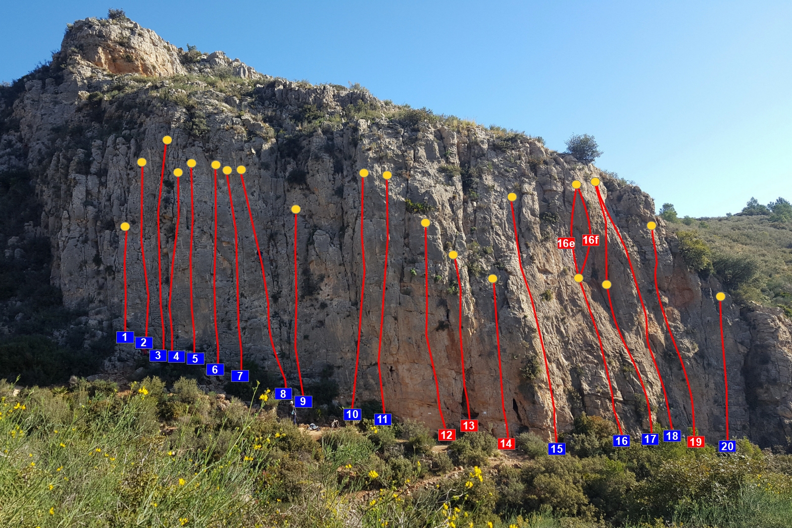 | 16 | La ley del canteo | 6c | 25m | Grade 4 to the 1st lower off, the left hand variation is 6b |
