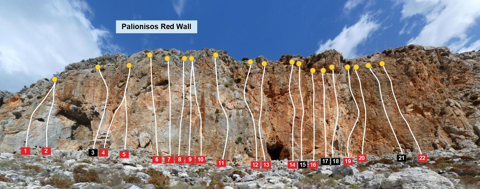 A conspicuous crag just a kilometre from Palionisos Bay, the Red Wall has some excellent steep and technical fingery routes on generally good rock. Well worth a visit on a cloudy day, otherwise the sun arrives early and you will cook